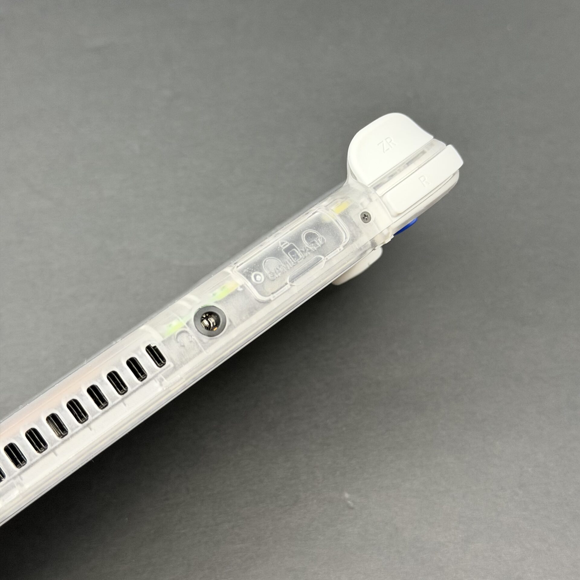 A white bezel screen protector is pre installed. (There may be some particles underneath the screen protector. This does not affect gameplay)